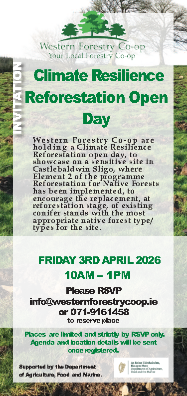 Western Forestry Co-op are holding a Climate Resilience Reforestation open day, to showcase on a sensitive site in Castlebaldwin Sligo, where Element 2 of the programme Reforestation for Native Forests has been implemented, to encourage the replacement, at reforestation stage, of existing conifer stands with the most appropriate native forest type/ types for the site.